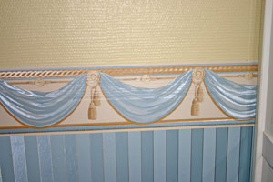 - La frise : cette bande de papier peint ajoute un élément décoratif à une surface austère ou une touche de finition à une tapisserie élaborée. Elle est utilisée pour la finition des bords et des plinthes, ou pour l’encadrement des portes et des fenêtres. Elle peut être collée en haut du mur, ou bien au milieu de celui-ci pour souligner la limite entre deux types de papier peint, ou la concordance papier peint/peinture ou bien encore distinguer des panneaux muraux du reste de la pièce. Par exemple, la frise est posée en astragale : le papier peint est interrompu à une certaine distance du plafond surmonté d’une frise. Le haut du mur étant peint comme le plafond pour donner l’impression d’une moindre hauteur. Les déclinaisons sont multiples, tout comme les effets visuels. La frise peut évoquer les anciens revêtements en bois, les lambris, les moulures, ou avoir des motifs permettant de faire un clin d’oeil à la fonction d’une pièce comme la cuisine ou la chambre d’enfant.