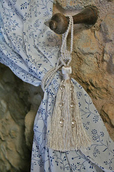 Dans cet ensemble, l'embrasse est un accessoire déterminant. Son style un tantinet rococo vient adoucir les éléments bruts qui dominent. La pierre, le bois et les pierreries offrent un ensemble harmonieux et délicat. Crédit photo : Isabelle Barèges